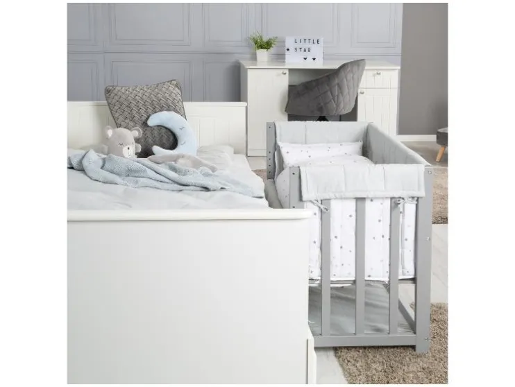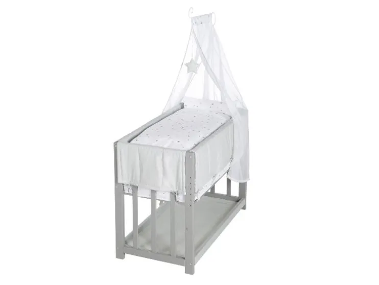 - Inclusief schuimmatras, beddengoed, nestje, hemel en hemelstang in het grijs design