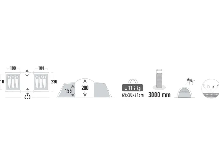De HIGH PEAK Borgholm 6.0 is een veelzijdige en ruime 6-persoons familietent, ontworpen voor comfort, privacy en een aangenaam binnenklimaat. Dankzij de 2 tegenover elkaar geplaatste slaapcabines biedt deze tent volop ruimte voor gezinnen of groepen, met een centrale leefruimte waar je gemakkelijk een tafel en zes stoelen kwijt kunt.