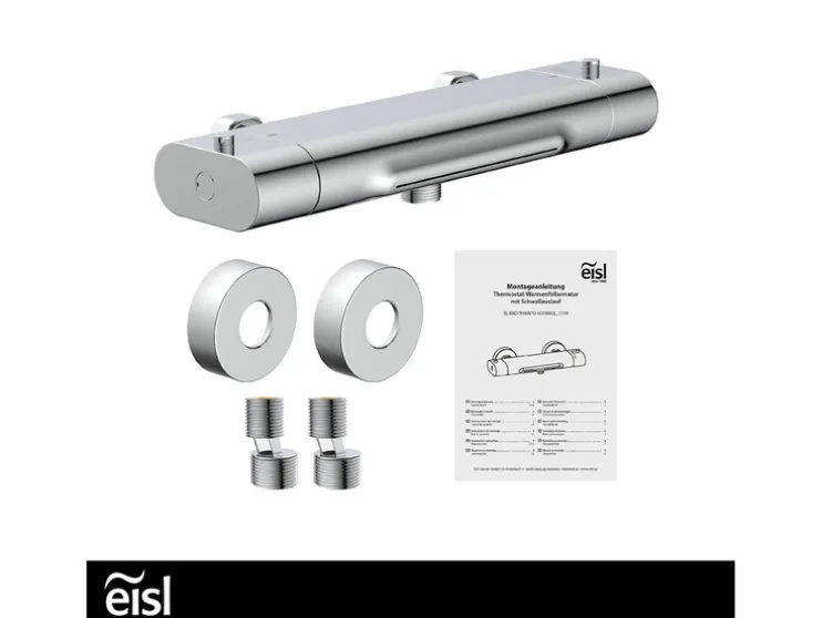 1x CARNEO douchekraan of badmengkraan met thermostaat, 1x montageset incl. 2x S-aansluiting en 2x muurrozet, montagehandleiding