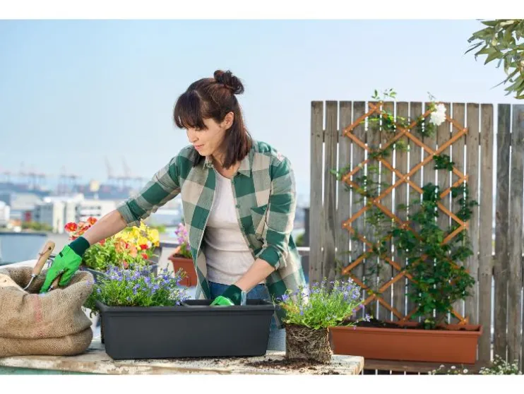 Vul de bloempot gelijkmatig met potgrond tot drie centimeter onder de bovenrand. Controleer regelmatig de stabiliteit van de bak en het vulniveau van de potgrond. Vul met planten die een maximale hoogte van 25 cm hebben.
