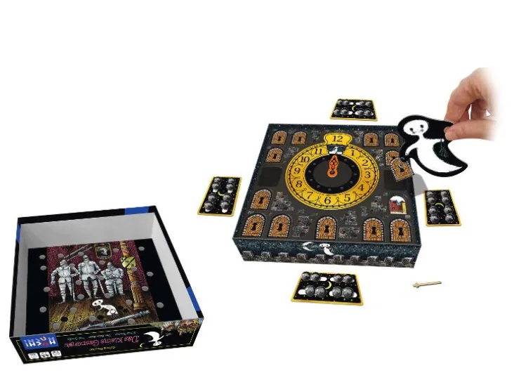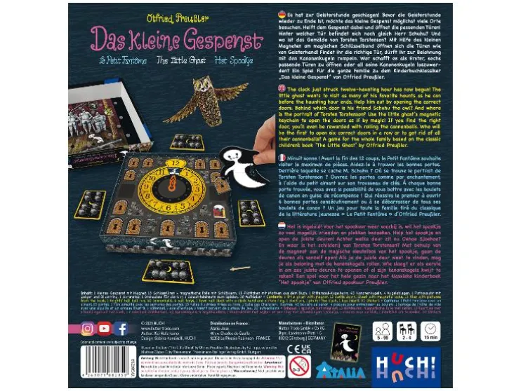 Voordat het spookuur weer voorbij is, wil het kleine spook zo veel mogelijk van zijn vrienden bezoeken. Maar dat is helemaal niet zo makkelijk, want eerst moeten daarvoor de juiste deuren geopend worden! De spelers helpen het spook daarbij en proberen de passende deuren te vinden. Hier is een goed geheugen gevraagd! In het spel leiden de kinderen het spook naar de deuren en kunnen deze met behulp van een kleine magneet openen. Is de juiste deur gevonden, kunnen de kinderen het kleine spook ter beloning helpen bij een van zijn favoriete bezigheden: Het rammelen met de kanonkogels. Daarvoor is echter behendigheid nodig. Wie lukt het als eerste om de taken te volbrengen voordat het spookuur afloopt? Een spel voor de hele familie bij het kinderboekklassieker “Het kleine spook” van Otfried Preußler.