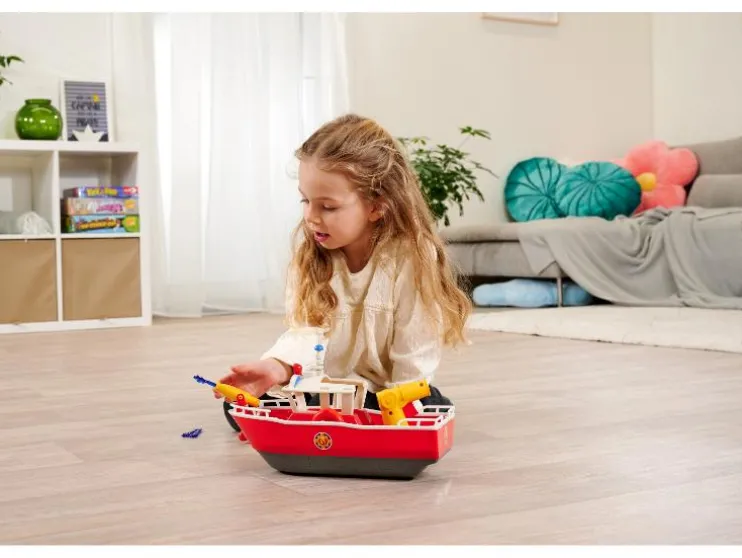 De brandweer is er! Met de coole Titan brandweerboot van Simba uit de populaire kinderserie „Brandweerman Sam“ ben je klaar voor elke missie. De rode reddingsboot drijft op het water en is daarmee het perfecte speelgoed voor spannende avonturen in bad. Aan boord is natuurlijk ook brandweerman Sam als speelfiguur, die vanaf het stuur alles in de gaten houdt. Met de 2 werkende waterkanonnen kun je ofwel water spuiten of de meegeleverde waterpijlen afschieten. Maak je klaar voor heldhaftige reddingsmissies!