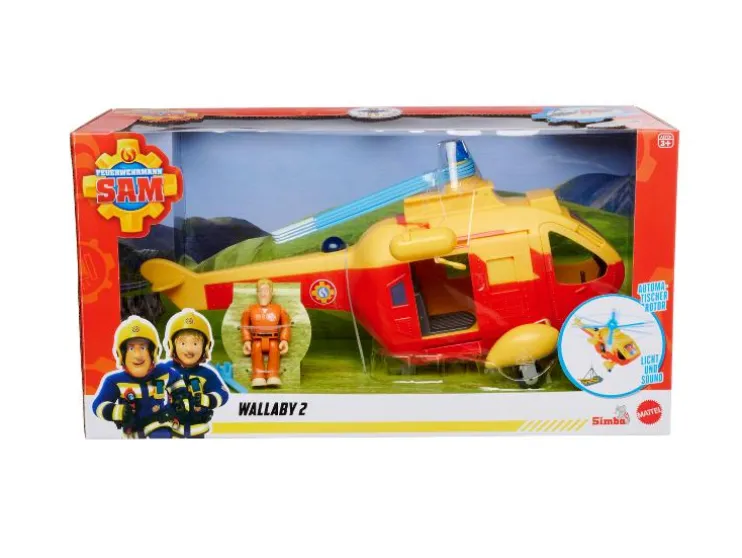 De bekende reddingshelicopter Wallaby II uit Pontypandy komt direct naar de kinderkamer! In het nieuwe, bijgewerkte ontwerp van de huidige tv-serie in geel en oranje is hij klaar voor elke missie. Aan boord is de moedige piloot Tom, die de helicopter veilig door de lucht stuurt. Dankzij de vele beweegbare elementen en de realistische licht- en geluidseffecten kunnen de spannendste reddingsmissies uit de serie worden nagespeeld. De werkende lier en de automatisch draaiende rotor zorgen voor extra speelplezier en stimuleren de fantasie van je kind.