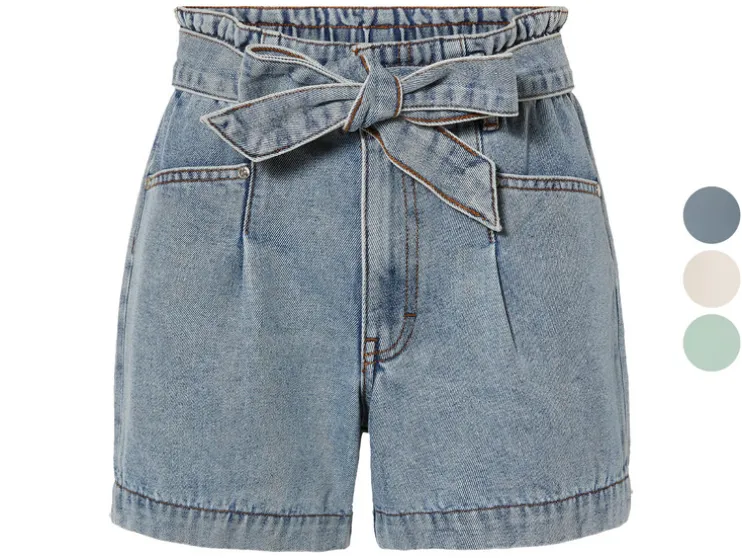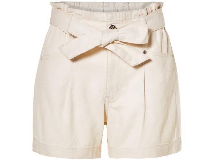 | Details: | Met decoratieve riem, hoge paperbag-tailleband, zijdelingse steekzakken |