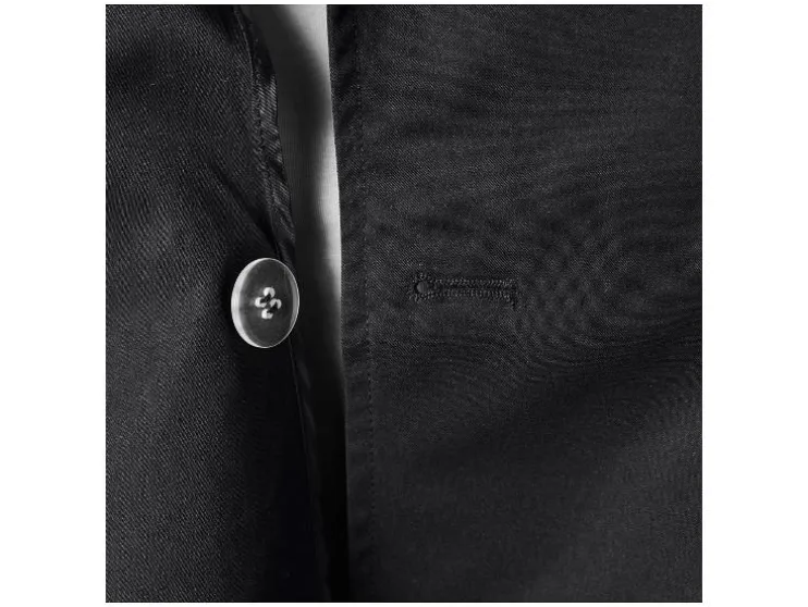 - Brede reverskraag en dubbele knoopsluiting met binnenknoop