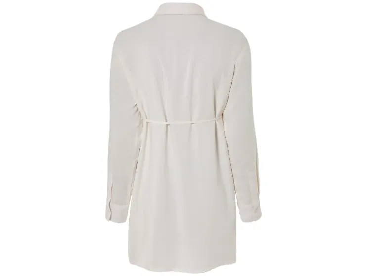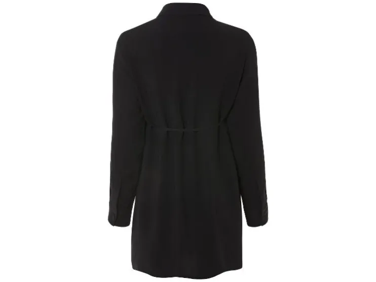 | Detail: | doorlopende knoopsluiting, afneembaar strikband in de taille, knoopsluiting aan de mouw, verlengde voorkant met afgeronde zoom |