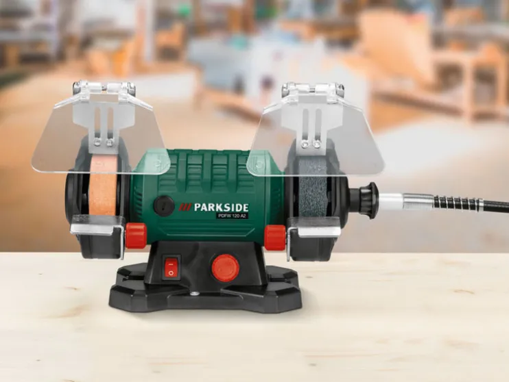 - De machine heeft 2 voorgemonteerde schijven met een diameter van 75 mm en een breedte van 20 mm (1 schuurschijf, 1 polijstschijf)