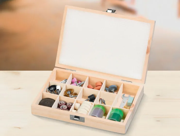 - Met omvangrijk, 103-delige toebehorenset in een houten koffer