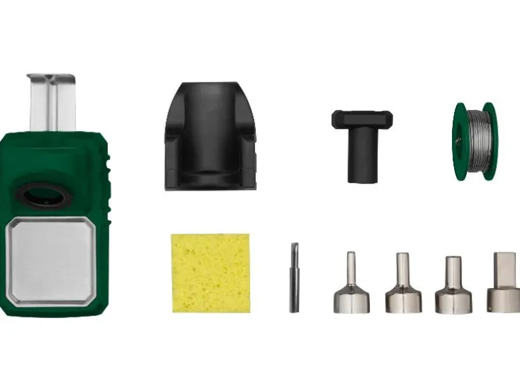 | Accessoires: | 4 opzetstukken voor heteluchtpistool, 2 soldeerpunten (1 puntige tip – voorgemonteerd, 1 platte tip), 1 platte tip (1 puntige tip voorgemonteerd), 40 g soldeertin (Ø 1,2 mm), 1 kunststof houder, 1 metalen houder met metalen bak, 1 reinigingsspons |