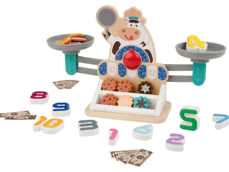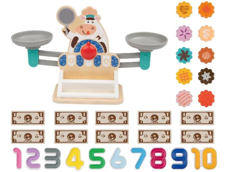 - Inhoud: 1 weegschaal, 10 cijfers, 10 koekjes, 10 papiergeld