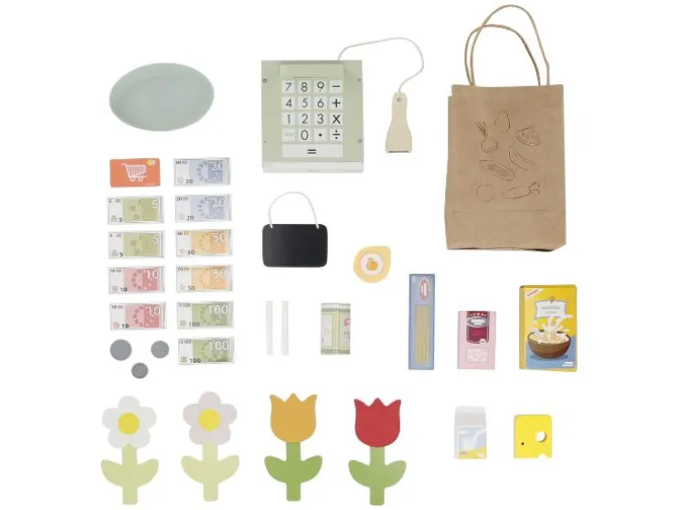 | Leveringsomvang: | Keuken: 1x spatel, 1x pollepel, 1x kookpan, 3x haken voor accessoires Winkel: 1x kassa (incl. speelgeld en klantenkaart), 1x weegschaal, 1x boodschappentas, 4x planten, 1x melk, 1x stuk kaas, 1x yoghurt, 1x pasta, 1x rijst, 1x erwten, 1x kartonnen doos, 1x bord |