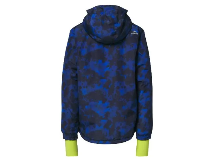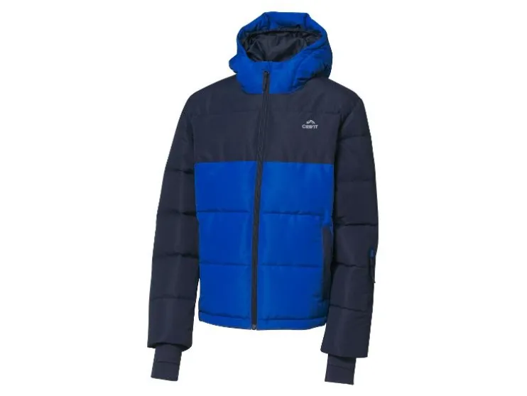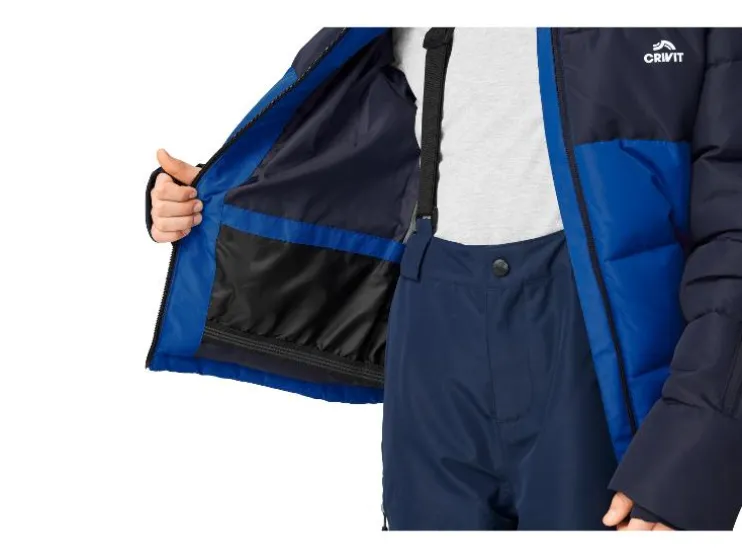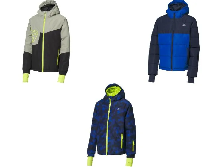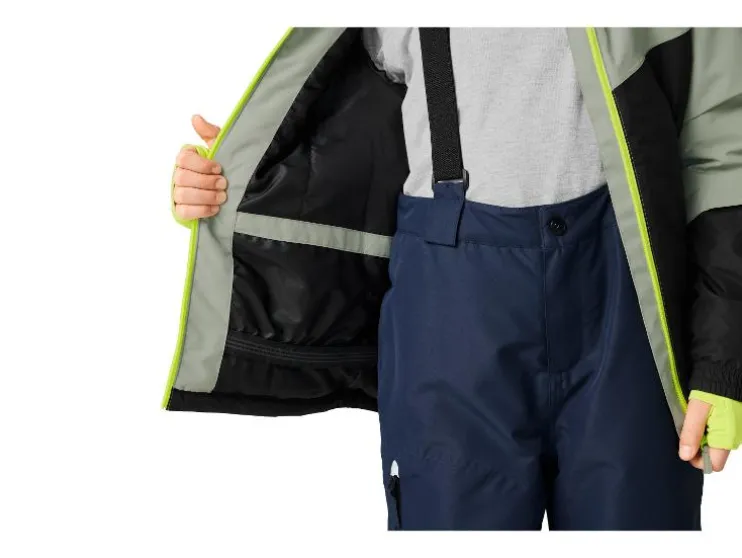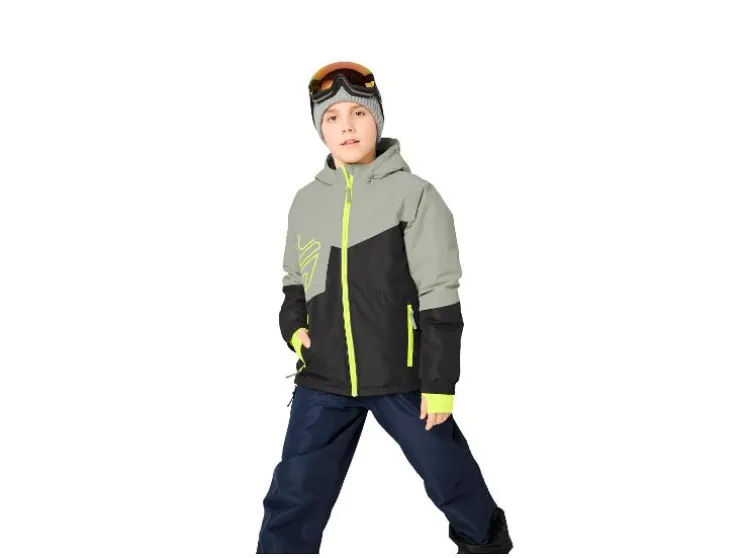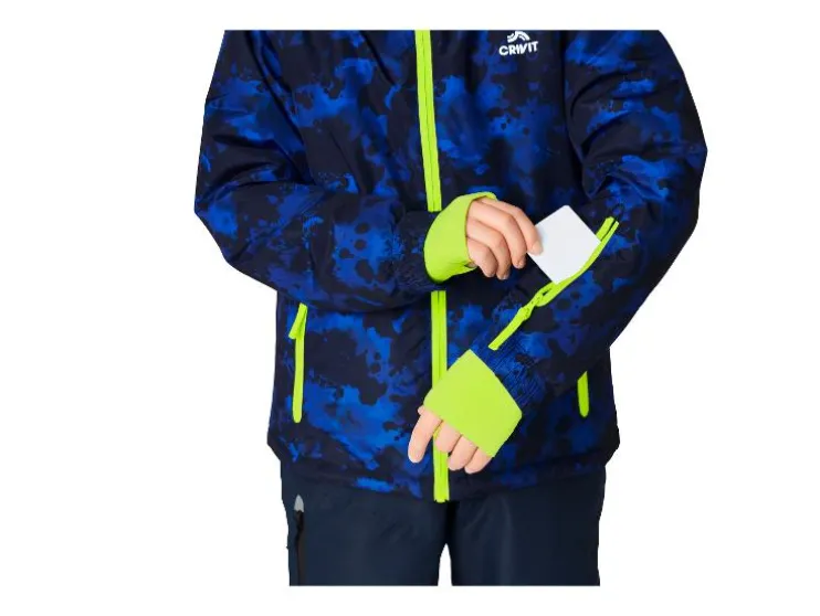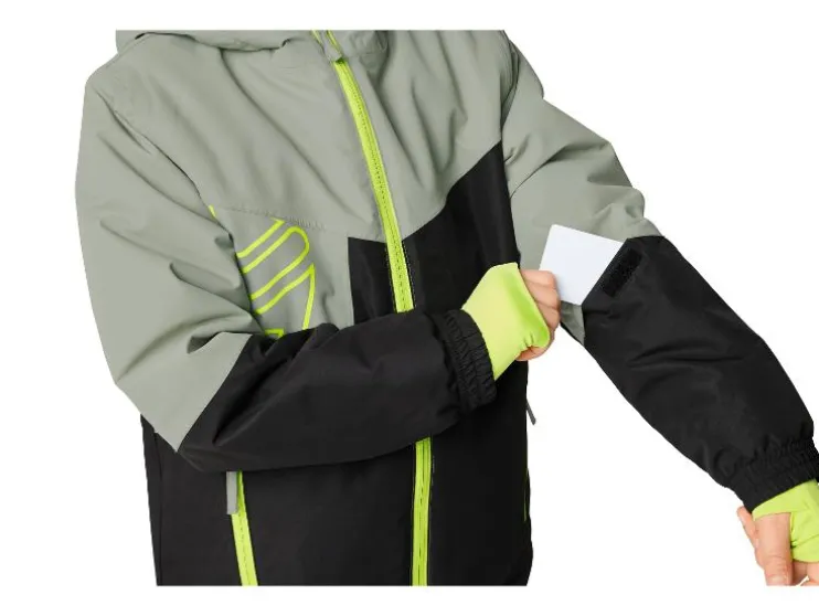 - Met reflecterende elementen, een doorlopende rits met kinbescherming en skipasvak op de mouw