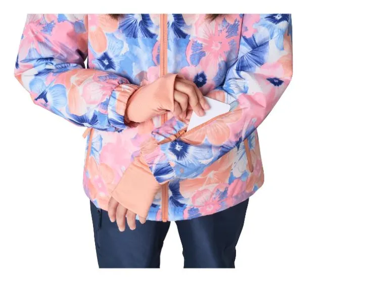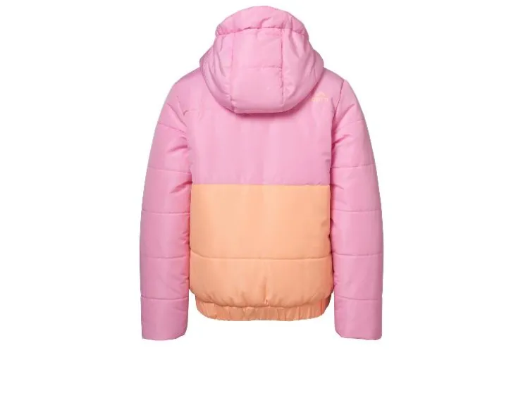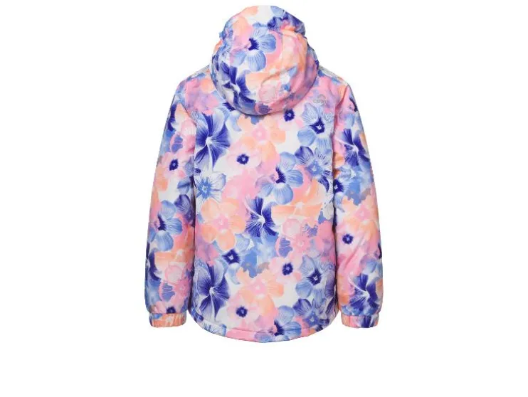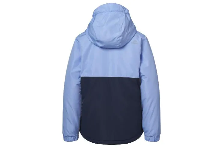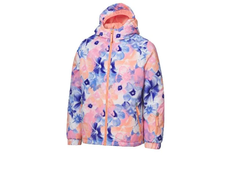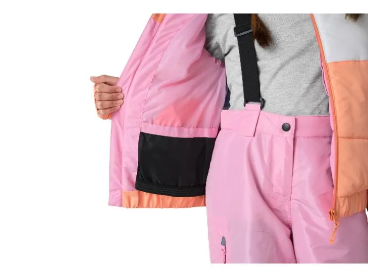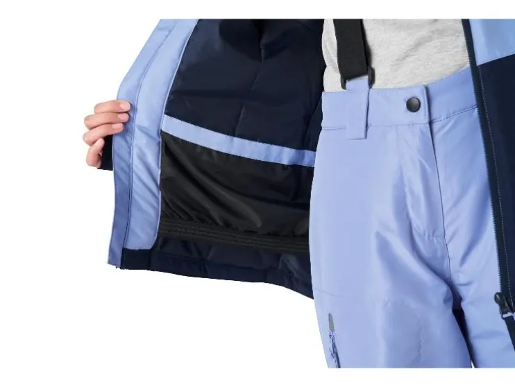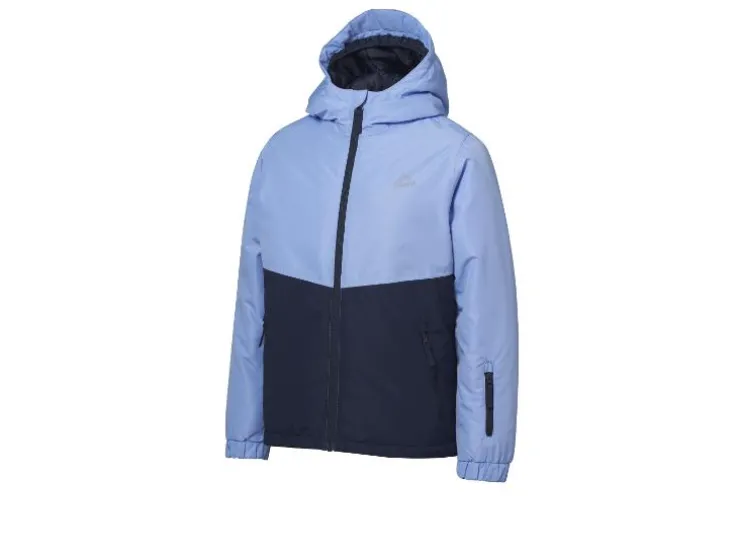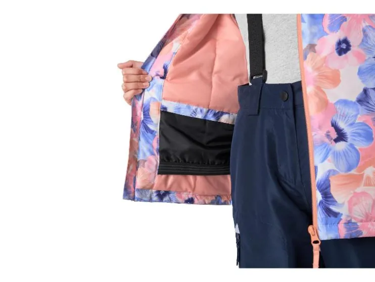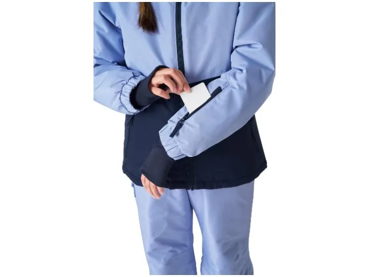 - Met reflecterende elementen, een doorlopende rits met kinbescherming en skipasvak op de mouw