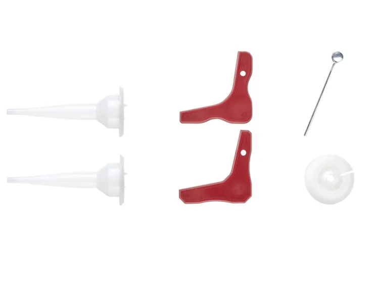 - Incl. drukschijf voor spuitzak, 2 opzetstukken en 1 staafje voor het doorprikken van gedroogde siliconen buisjes