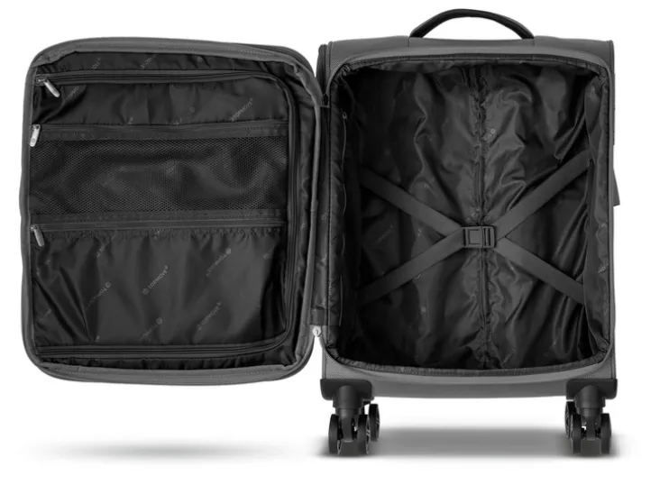 - Functionele binnenafwerking met ritsvakken, kruisriempjes en apart zakje voor wasgoed of schoenen