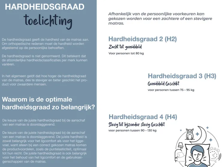 - Hardheid: medium (H2), stevig (H3) en extra stevig (H4)
