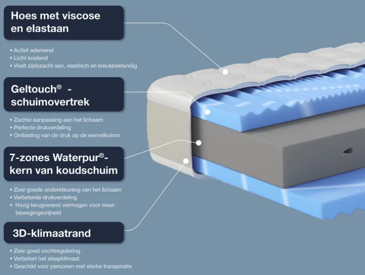 - Kernstructuur: 5 cm 7-zones geltouch-schuimtopper, 12 cm 7-zone Waterpur-koudschuim, 5 cm 7 zone geltouch-schuimtopper