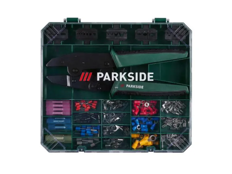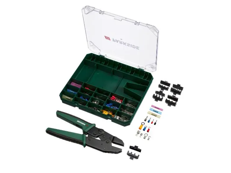 - 5x verwisselbare inzetstukken, geschikt voor o.a.: 1x voor niet-geïsoleerde steekverbinders (0,5–6,0 mm²), 1x voor geïsoleerde kabelschoenen en stootverbinders (0,5–6,0 mm²), 1x voor adereindhulzen (0,25–10,0 mm²), 1x voor krimpkous-stootverbinders (0,5–6,0 mm²) en 1x voor niet-geïsoleerde krimp- en buisschoenen (0,5–10 mm²)