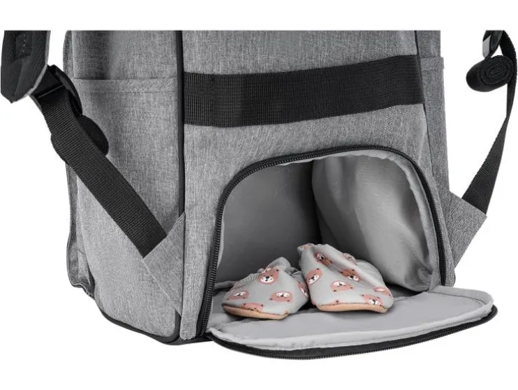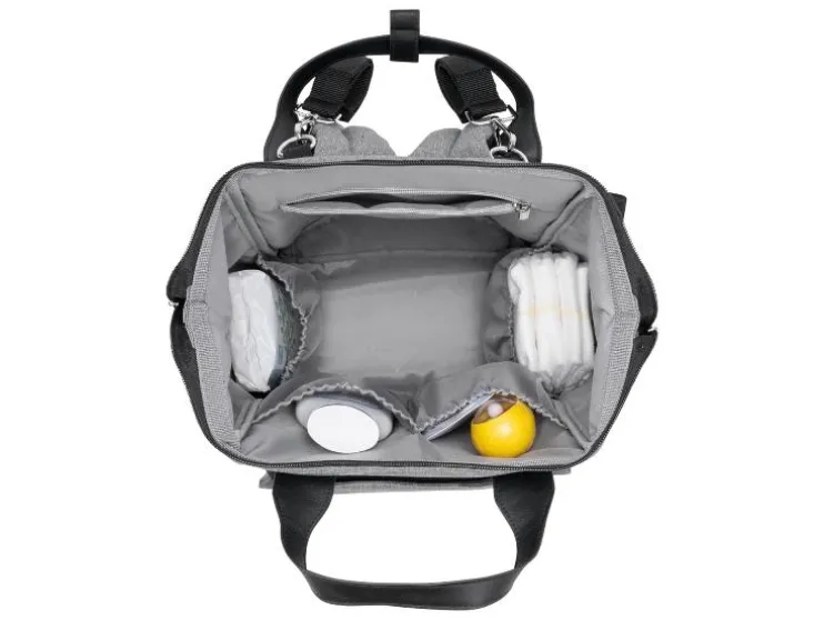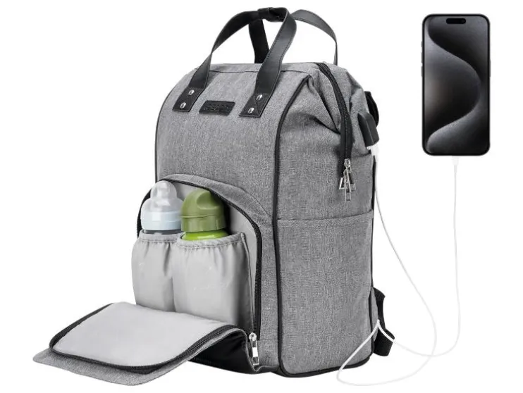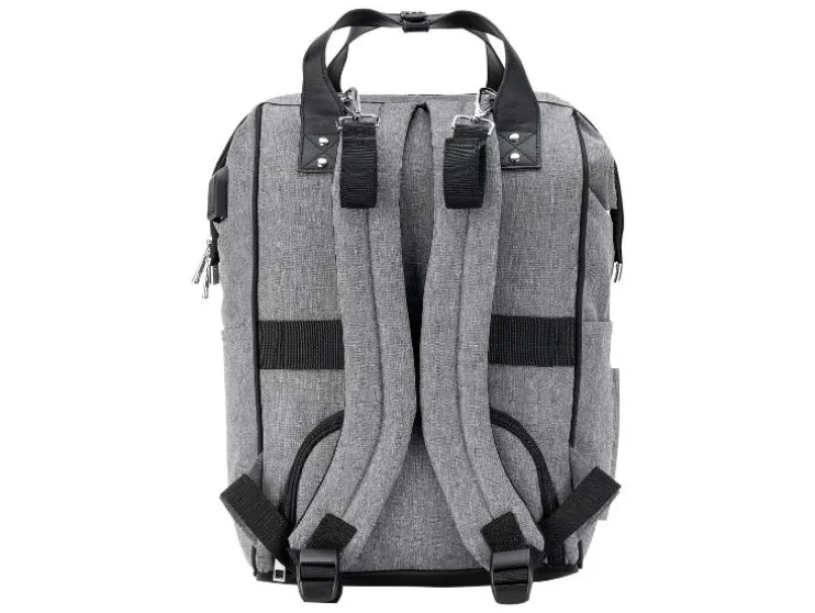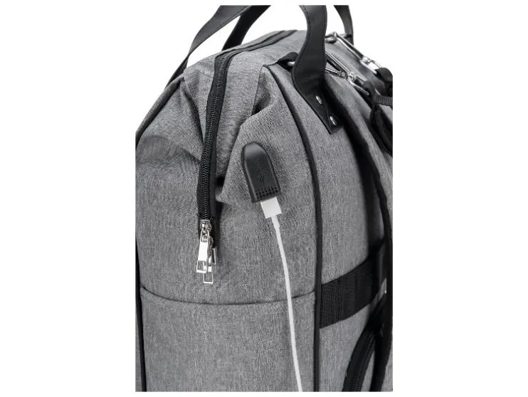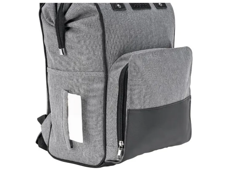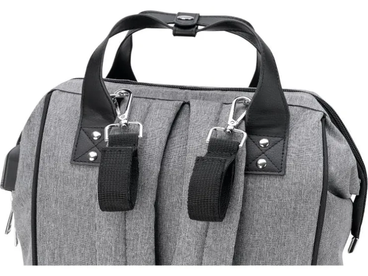 De combinatie van stijlvol kunstleer en waterafstotend materiaal maakt de luiertas niet alleen tot een echte blikvanger, maar ook behoorlijk praktisch. De vele binnen- en buitenzakken bieden voldoende ruimte voor baby’s flesje en de meegeleverde verschoningmat. Maar ook voor de ouders moet gezorgd worden: een geïntegreerde poort aan de zijzak maakt het opladen en het gelijktijdig gebruik van de telefoon mogelijk.