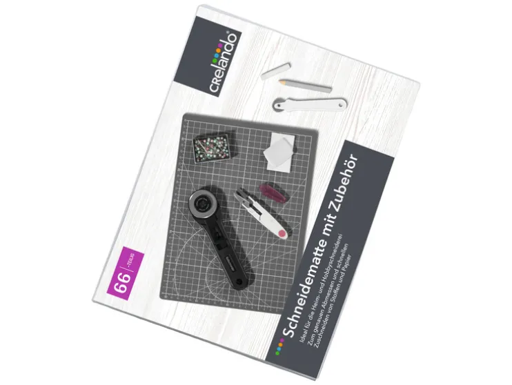 - 1 stevige snijmat (ca. 30 x 22 cm) met praktisch raster, dubbelzijdige schaal (cm/inch) en hulplijnen voor hoeken