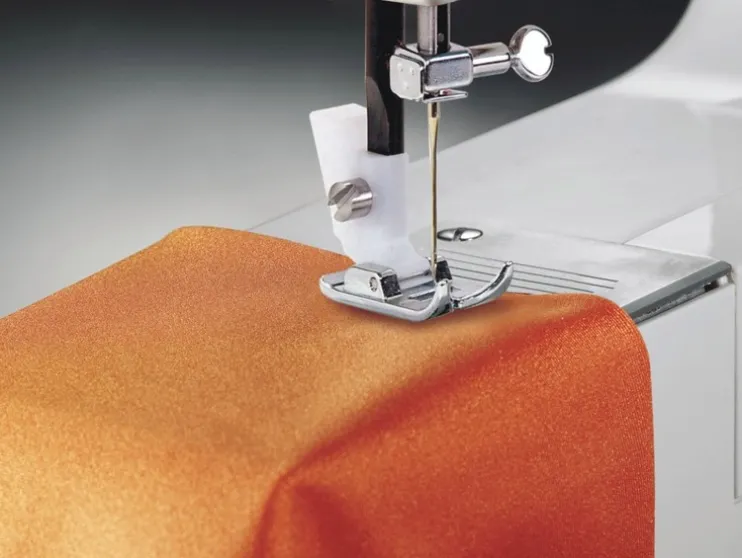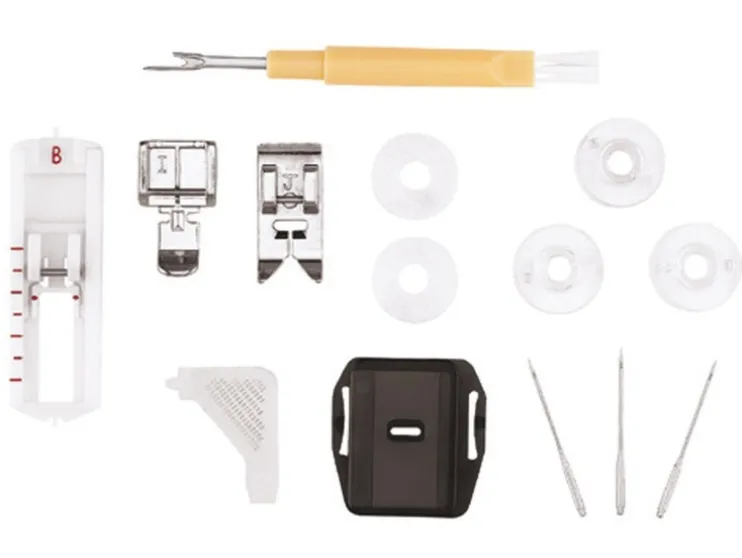 Inclusief universele voet, knoopsgatenvoet, tornmesje/ borstel, randgeleider, grijper, pakket naalden, borduur- en opvulplaat, viltkussen, L-schroevendraaier en stofkap