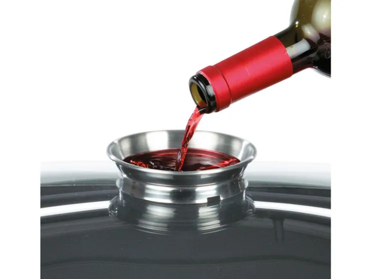 Deze ovale braadpan is gemaakt van hoogwaardig 18/8 roestvrij staal en heeft een glazen deksel met aromaknop – voor het besprenkelen van het voedsel met bijv. wijn en een roestvrij stalen deksel met thermo capsule bodem – ook afzonderlijk te gebruiken voor inductie.
