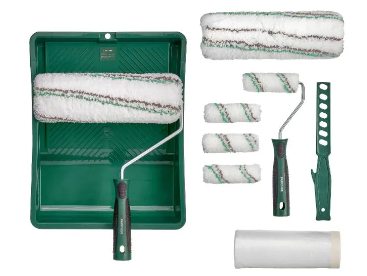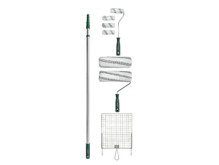 | Afmetingen: | alle: roller: ca. L 25,5 cm x Ø 8,5 cm; beugel: ca. L 30,5 x B 25 x H 3,3 cm; roller: ca. L 10 cm x Ø 3,5 cm; beugel: ca. L 38,5 x B 9 x H 3,3 cm; 10-delig: telescoopsteel: ca. L 112 x Ø 2,6 cm; 11-delig: verfbak: ca. L 28 x B 38 cm; afdekfolie met plakrand: ca. 2,7 m uitvouwbreedte x 16 m looplengte; roerstaaf: ca. L 27 x B 4 x H 0,65 cm; metalen afstrijkrooster: ca. L 26 x B 38 cm (afmetingen met handvat), |