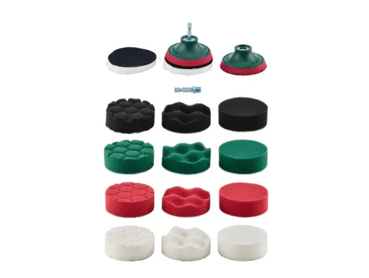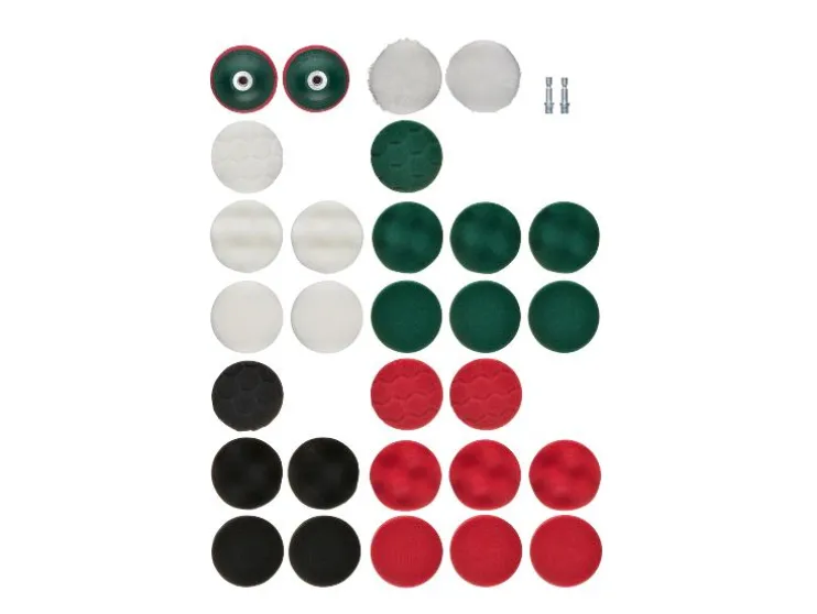 | Inhoud: | 25x polijstschijf in verschillende hardheden (5x zwart: zeer fijn, 7x groen: fijn, 8x rood: medium, 5x wit: grof), 2x synthetisch wollen pad, 2x schuurspons met klittenbandsluiting, 2x adapter M10 op 6,3 mm zeskant |
