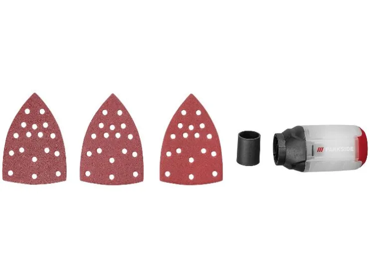 | Accessoires: | 1 stofopvangbox, 1 adapter voor externe stofafzuiging, 3 schuurbladen (korrel: 80 / 120 / 180) |