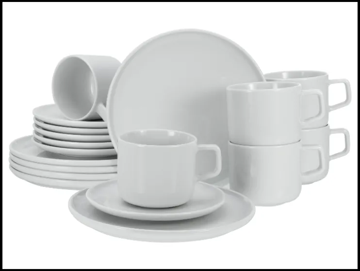 | Afmetingen: | 12-delig: 6 dinerborden (Ø 26 cm) en 6 soepborden (Ø 20 cm); 18-delig: 6 dessertborden (Ø 20 cm), 6 bovenkopjes (25 cl) en 6 schoteltjes (Ø 15 cm) |