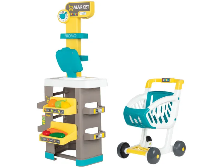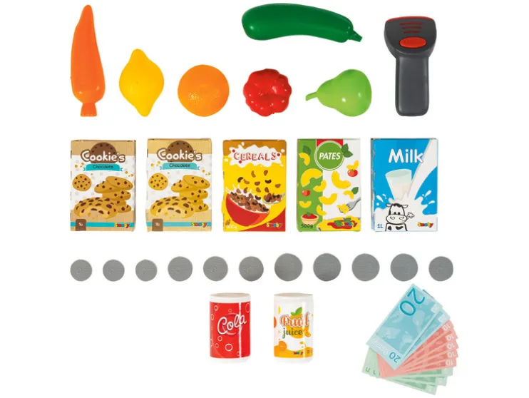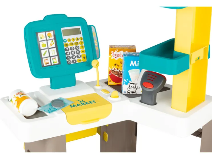 De winkel is een echte klassieker voor de kinderkamer – de Smoby supermarkt heeft ook het origineelgetrouwe design van een echte supermarkt en wordt geleverd met een winkelwagen! Zo kunnen de kinderen gemakkelijk hun wekelijkse boodschappen doen. Net als in het echte leven kan er een munt in de greep worden geplaatst. Achter of voor de toonbank, de elektronische kassa met LCD-scherm, rekenfunctie en een scanner met piepgeluid en lichtfunctie maakt winkelen echt leuk. Met de microfoon (zonder functie) kan de caissière een oproep doen en het uitklapbare geldvak is een geweldige plek om speelgeldbriefjes en munten in op te bergen. Zo leren kinderen spelenderwijs op de juiste manier met geld omgaan. Het assortiment van de supermarkt is gevarieerd en biedt een breed scala aan producten voor kleine klanten: groenten en fruit, snoep en verpakkingen voor speelvoeding. Alle goederen kunnen netjes worden gepresenteerd in de schappen. Dankzij de instelbare klok kan elke winkelier zelf bepalen wanneer hij het voor gezien houdt.