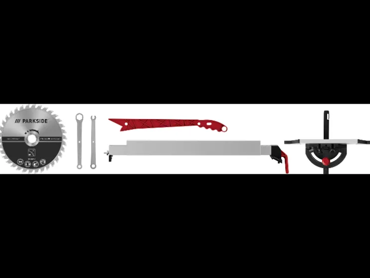 | Toebehoren: | 1 dwarsdoorsnedegeleider, 1 schuifstok, 1 langsgeleider, 2 tafelaanbouwen, 1 zaagblad (voorgemonteerd), onderstel, gereedschap |