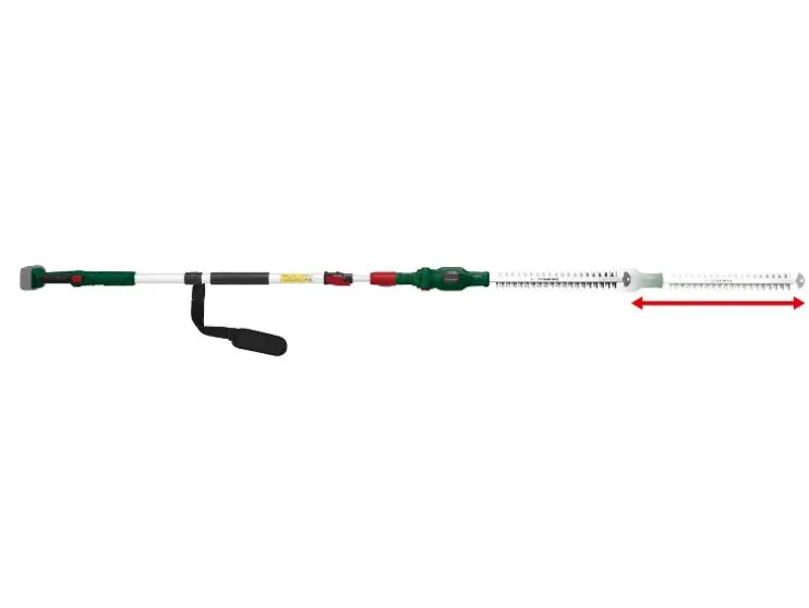 | Afmetingen | Heggenschaar zonder accu: ca. 233 x 85 x 2000 – 2705 mm Mesbescherming: ca. 505 x 85 mm Totale lengte: ca. 2,7 m |
