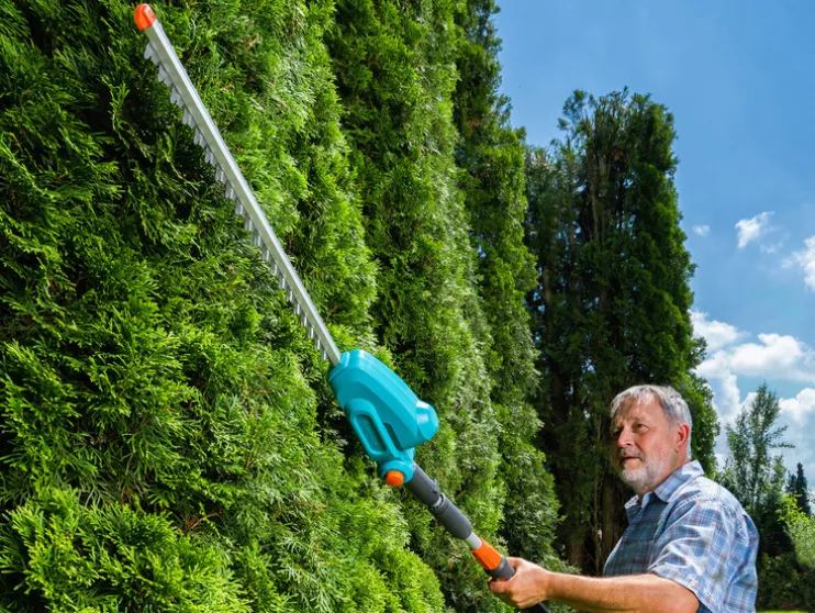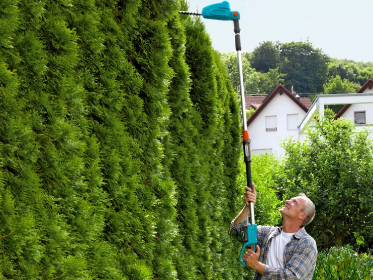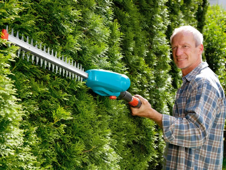 Met de GARDENA accu-telescoop-heggenschaar kunnen zelfs drie meter hoge heggen zonder veel moeite worden geknipt. Want je hoeft niet op een stroomkabel te letten en hebt geen ladder nodig, maar kan steeds met beide voeten op vaste grond staan.