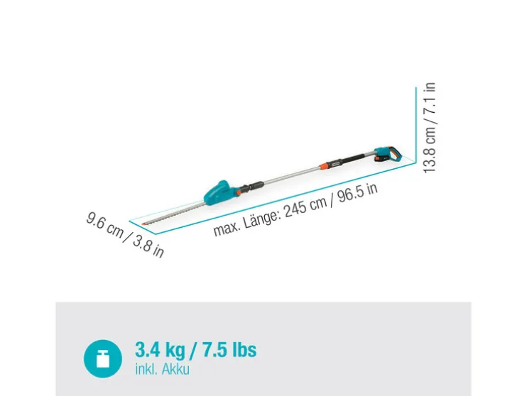 De telescoopschaar weegt met accu slechts 3,4 kilogram, de greep is ergonomisch gevormd en hij heeft een optimaal zwaartepunt. Daarom ligt hij ook dan rustig en veilig in de hand, wanneer de telescoopsteel volledig is uitgeschoven. Zelfs het dak van de heg kan gemakkelijk worden gevormd vanaf de grond: de kop van de schaar kan worden gekanteld – een functie, die ook zeer comfortabel is bij het knippen van bodembedekkers, omdat je niet hoeft te bukken en het je knieën spaart. Probleemloos vallen tot 16 millimeter dikke twijgen en takken. De geoptimaliseerde mesgeometrie verzekert, dat elke snede efficiënt en zuiver wordt uitgevoerd. Dankzij de zwaardlengte van 42 centimeter kun je heggen snel over de hele breedte in vorm brengen. Een goed zichtbare LED-indicator toont het actuele laadniveau van de accu. Je weet dus altijd, hoe lang je nog kunt werken. Voor het transport kan de heggenschaar zonder gereedschap snel in twee delen worden gescheiden en zo kun je deze dan ook gemakkelijk opbergen.