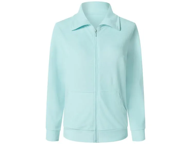 - Blauw, lila: met opstaande kraag, doorlopende ritssluiting en kangoeroezakken