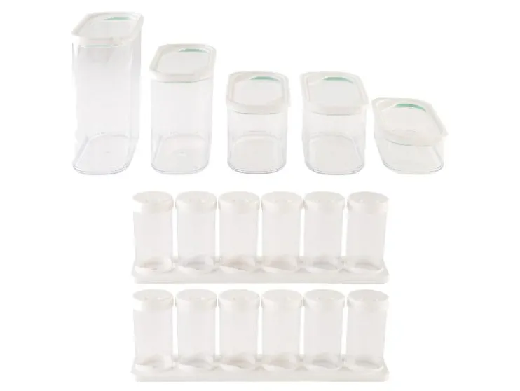 | Afmetingen: | Voorraaddozenset: 2 l: ca. L 16 x B 9,6 x H 20 cm 1,4 l: ca. L 16 x B 9,6 x H 15 cm 0,9 l: ca. L 16 x B 9,6 x H 10,5 cm 0,4 l: ca. L 16 x B 9,6 x H 6 cm Kruidenpotjes: Potten: Ø 5 x H 10 cm Houders: ca. L 33,3 x B 7,4 x H 1,7 cm |