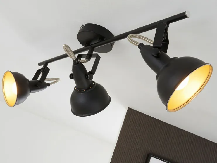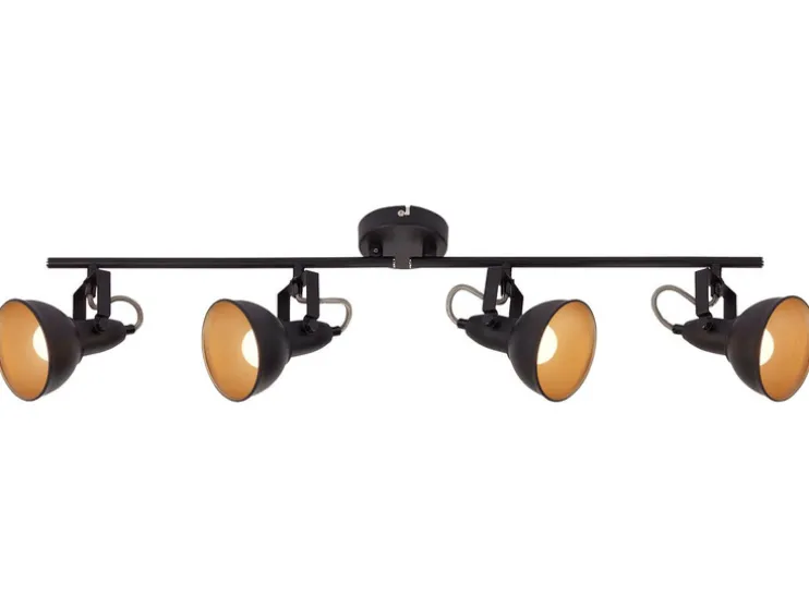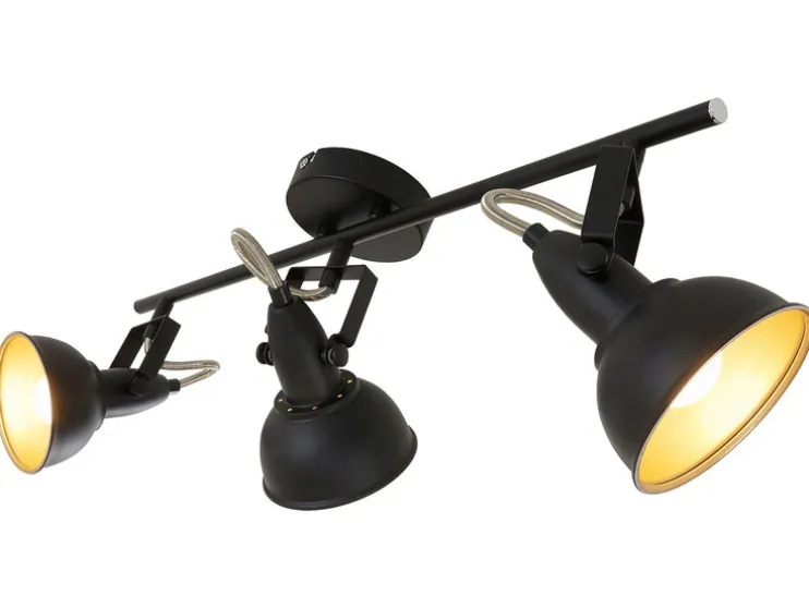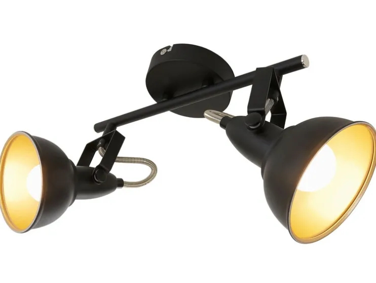 Moderne wand- en plafondlamp vervaardigd uit metaal. De spots in elegante retro/vintage-optiek zijn ideaal als woonkamerlamp of slaapkamerlamp. De stralers zijn draai- en zwenkbaar en dus individueel instelbaar. De lichtbronnen zijn niet inbegrepen. Het is natuurlijk mogelijk om LED-lampen te gebruiken met een aanzienlijk lager wattage. De lampenkappen zijn aan de buitenkant zwart en aan de binnenkant goudkleurig. De diameter van de lampenkappen bedraagt 105 mm.